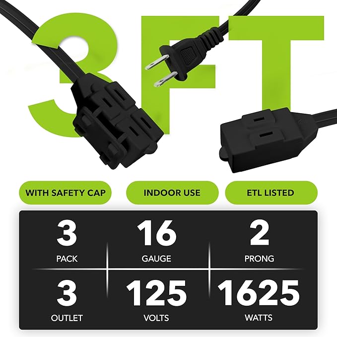 - Maximize Convenience with 3 Outlets: With three outlets in each 3ft extension cord, this 2-prong power cord allows you to power multiple devices at once, making it perfect for lamps, fans, holiday lights, and more. It supports a total load of 13 Amps, 125 Volts, and 1625 Watts, offering reliable power for your everyday indoor needs.