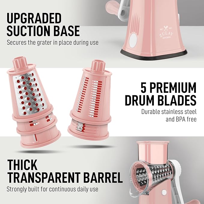 Zulay Kitchen Rotary Cheese Grater 5 Blade Cheese Shredder - Manual Hand Crank Cheese Grater With Reinforced Suction & 5 Interchangeable Drums - Easy to Use, Vegetable Chopper Round Mandoline Slicer