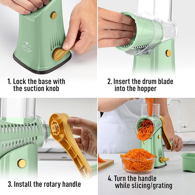 - GRATE, SLICE, AND SHRED: With 5 interchangeable stainless steel blades, this rotary grater is perfect for thin and wavy vegetable slicing, coarse shredding, and fine and coarse julienne. The sharp blades of this multifunctional grater are perfect for grating with carrots, cucumbers, potatoes, nuts, cookies, and even a soft block of cheese.