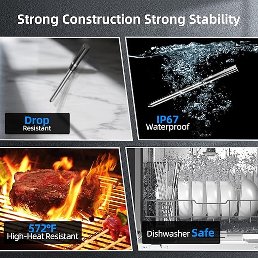 - 【Dual-Sensor Precision & Durable Food-Grade Design】The Aurasky wireless meat thermometer features dual sensors and a high-temperature safety line, delivering precise temperature readings to prevent overcooked or undercooked meals. Built to last, it boasts an IP67 waterproof rating and exceptional thermal shock resistance, making it ideal for grilling, frying, and other high-heat cooking methods. Crafted with a ceramic handle and an FDA 316 stainless steel probe, this cooking thermometer is made from food-grade materials, ensuring both safety and durability for all your culinary adventures
