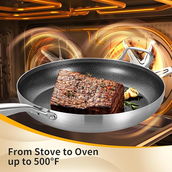 Inqibee 12-Inch Hybrid Tri-Ply Stainless Steel Non Stick Chef's Frying Pan with Lid and Helper Handle,Skillet,Induction Cooking Pan,Dishwasher and Oven Safe