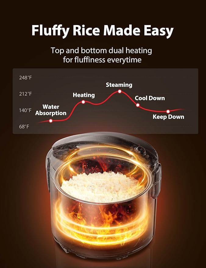 - Fluffy Rice Made Easy: Rice are heated evenly and quickly by dual heating from top and bottom. Combining with intelligent cooking progress, fluffy rice is so easy!