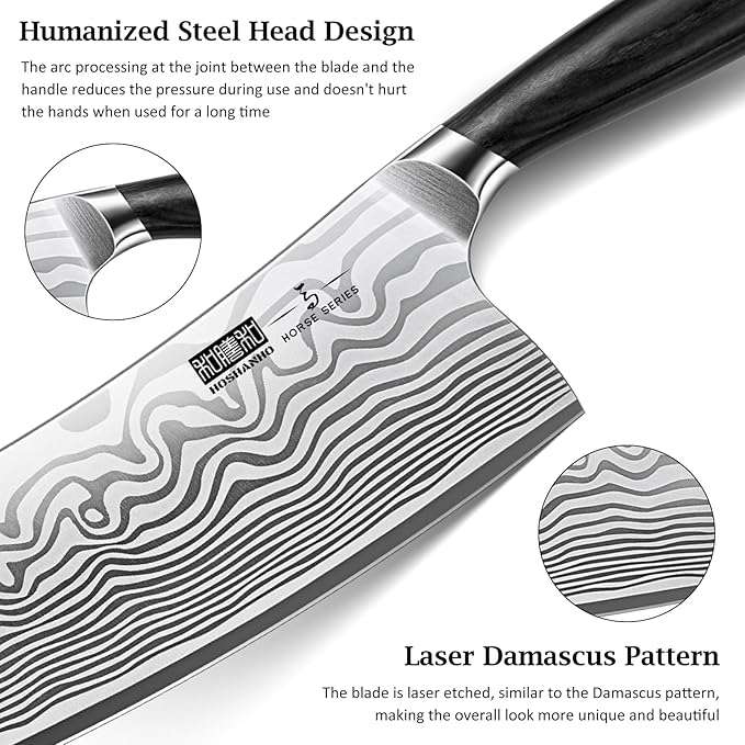 - 【Ergonomic Pakkawood Handle】Ergonomically designed handle is made from durable pakkawood, which can help you get good hold feeling and non-slip effect, preventing the knife from falling easily when cutting. This cleaver strikes the perfect balance between control and power