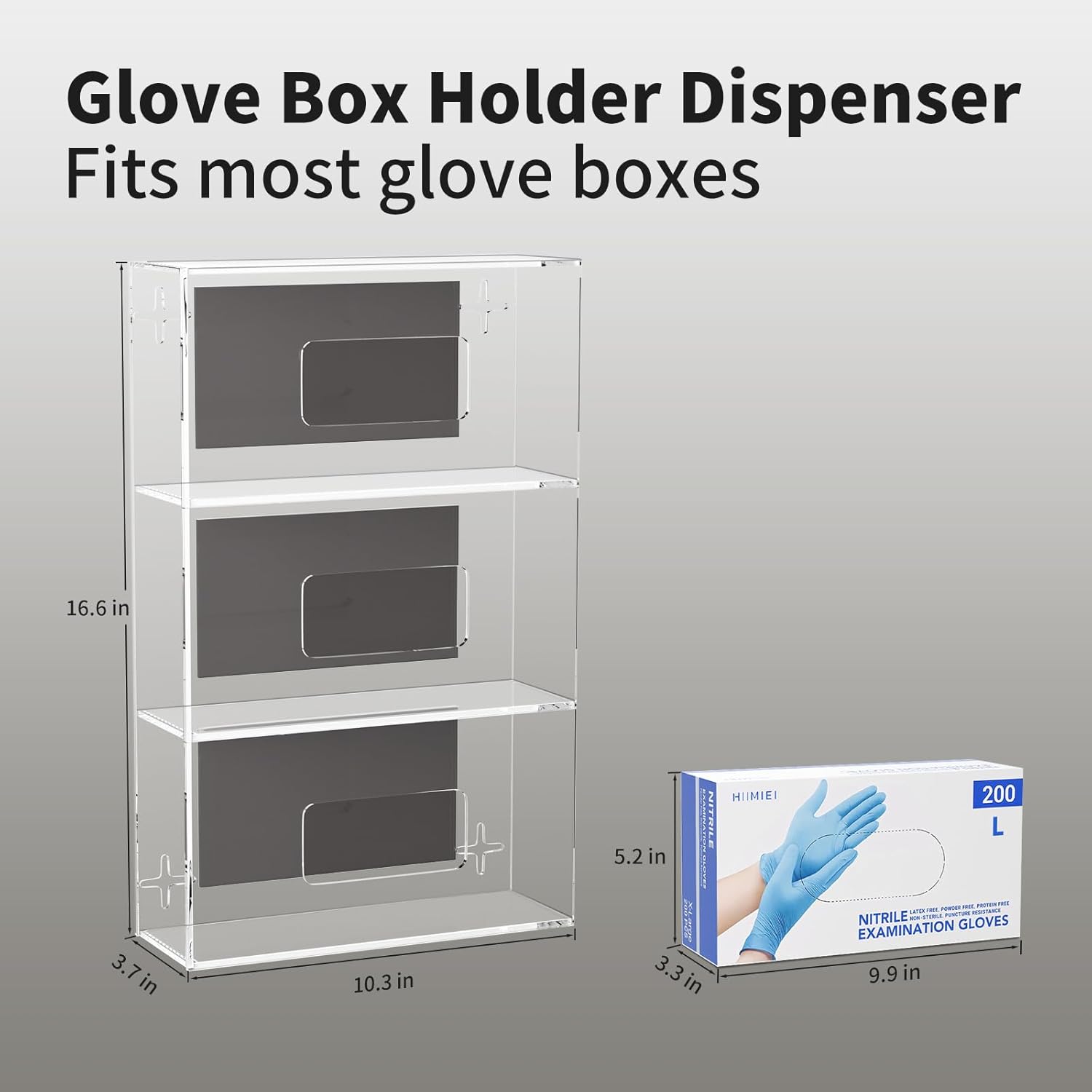 - 【Premium crystal acrylic】 Highly transparent acrylic of this rubber disposable gloves holders inside with single,double,triples size options, the package contains acrylic gloves dispenser with wall mount screws, 10.3"X3.7"X16.6".