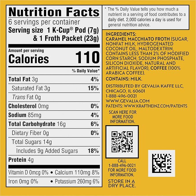 - 6 ct box of Gevalia Frothy Artificially Flavored Caramel Macchiato Espresso Style K-Cup Coffee Pods & Froth Packets