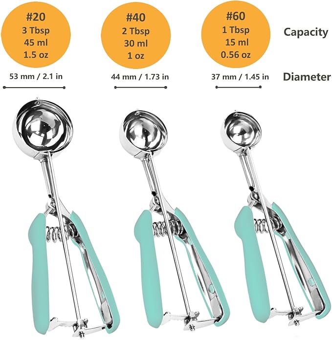 - 3 SIZES, MULTIPLE USES. The cookie scoop set includes: Small cookie scoop, #60 scoop (1 Tbsp/15ml/0.5 oz), Medium cookie scoop, #40 scoop, (2 Tbsp/30ml/1 oz), Large cookie dough scoop, #20 scoop, (3 Tbsp/45ml/1.5 oz). They can be ice cream scooper, cookie scooper, cupcake scoop, meatball scoop, melon baller scoop, measure spoon. You can use the cookie scoops easily to create different size balls of ice cream, cookie dough, muffin, meatballs, mashed potatoes, melon and other fruits sorbet.