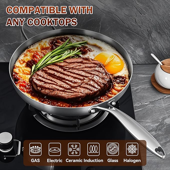 - Triple-Ply Construction for Fast Heating & Energy Efficiency: This stainless steel pan features a premium triple-ply base (stainless steel-aluminum-stainless steel) for rapid, even heat distribution. Retains heat effectively for consistent cooking results while reducing energy consumption, perfect for searing, frying, and simmering