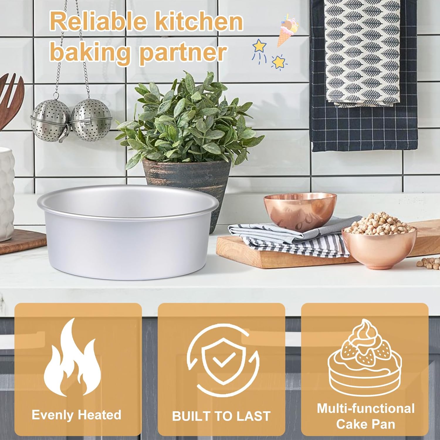 - 🎂【PREMIUM QUALITY & HEAT EVENLY】This round cake pan is made of high quality aluminum alloy which is sturdy and durable. Compared to stainless steel, aluminum alloy heats evenly and has no hot spots. Also, stainless steel may rust after long-term use, but aluminum cake pans will not have such problems. Ideal for baking various beautiful cakes / cream brulee for any occasion.