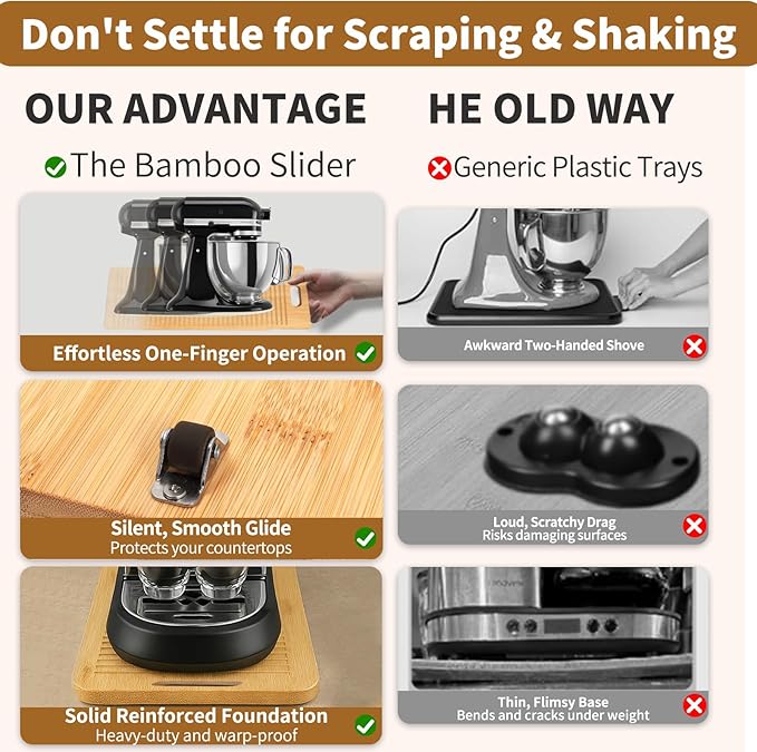 - 【Sturdy and Durable Construction】The coffee pot slider tray is made from 100% natural bamboo with a strong three-layer design and a thickness of up to 0.6 inches, capable of supporting heavy appliances up to 40 lbs without warping or bending, and even if coffee or juice spills, the tray won’t be damaged, ensuring long-term, reliable use in your kitchen