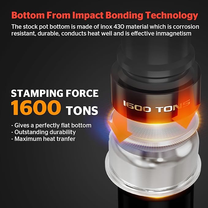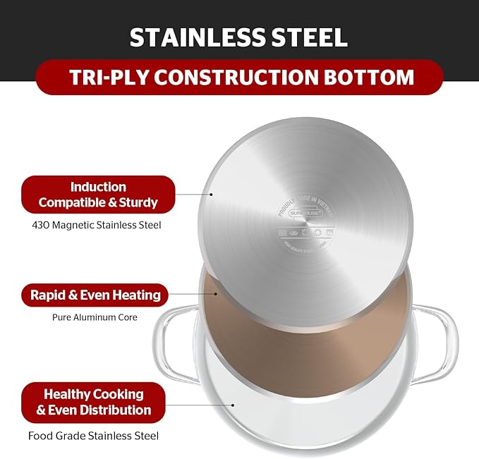 - Heats Up Quickly With Tri-Ply Stainless Steel - The unique whole body tri-ply bonded construction alternates layers of stainless steel and aluminum for maximum durability. This pot heats up quickly and evenly while preventing hot spots, ensuring better food cooking and energy savings. Say goodbye to hot spots and toxins, enjoy healthy consistent cooking results that last a lifetime