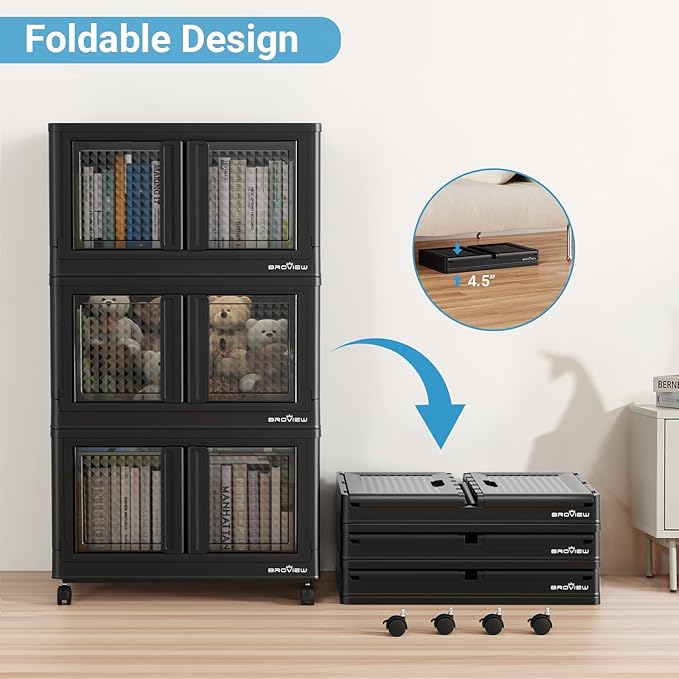 BROVIEW 600Qt Stackable Storage Bins with Lids, 150Gal Closet Organizers and Storage Drawer, Plastic Collapsible Storage Bins with Doors, Heavy Duty Store Box Cabinet for Home Kitchen, 6Pack Black