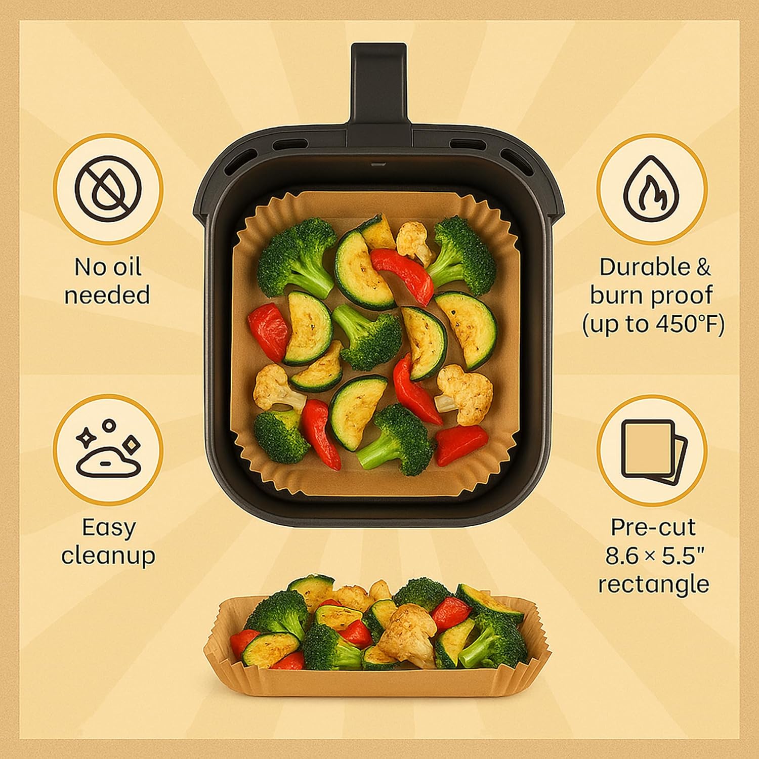 - Customized Convenience: Each pack includes 125 pre-cut 8.5x5.5 inch rectangle liners, eliminating the hassle of trimming or folding to fit your air fryer. Enjoy the convenience of perfectly sized liners every time.