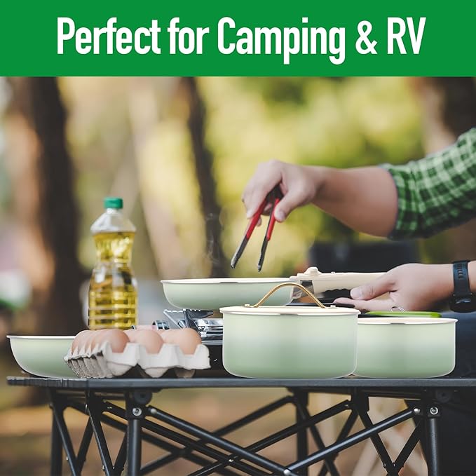 20pcs Ceramic Cookware Set Nonstick, Detachable Handle Pots and Pans Set, Non Toxic,No PFAS & PTFE & PFOA, Dishwasher/Oven Safe, RV Kitchen Set Removable Handle for Cooking, Green