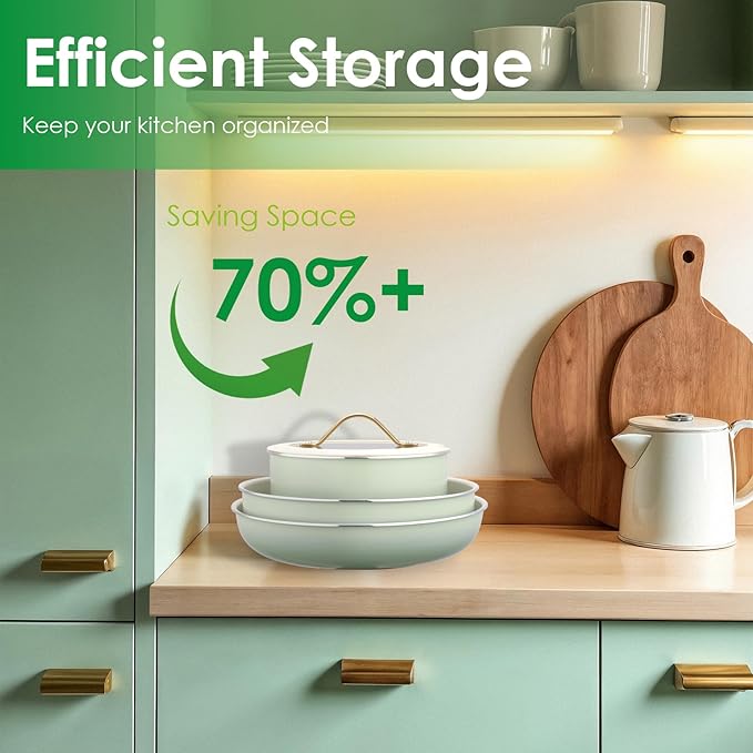 - Space Saving: ONGIFT stackable pots and pans set with detachable handles keep the kitchen organized and tidy, saving 70% of space, storage is simple. Perfect for kitchen and an ideal choice for RVs or campers