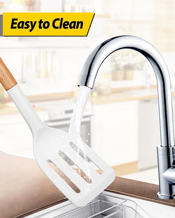 Pack of 2 Silicone Cooking Spatula, Heat Resistant Solid Turner, Non Stick Slotted Spatulas with Wooden Handle,Ideal Wood Kitchen Utensils Set for Frying, Baking, Flipping, Turning (WHITE)