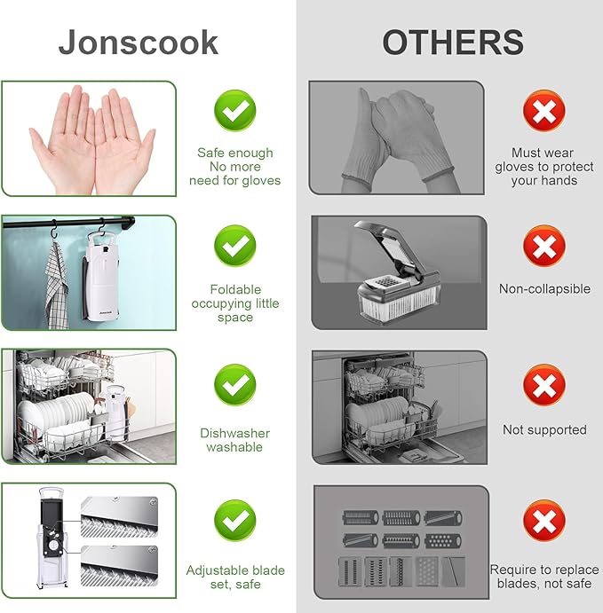 - 【Protect Your Hands with Our Safe Vegetable Chopper】- The Jonscook mandoline food slicer is designed with built-in blades, ensuring no direct contact with sharp edges. Unlike other slicers that require blade changes or cumbersome safety gloves, this chopper is safer and more convenient. It’s perfect for all ages, including the elderly and children, making meal prep worry-free.