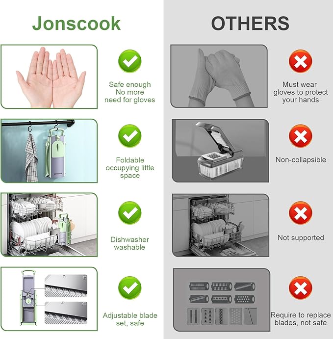 - 【Protect Your Hands with Our Safe Vegetable Chopper】- The Jonscook mandoline food slicer is designed with built-in blades, ensuring no direct contact with sharp edges. Unlike other slicers that require blade changes or cumbersome safety gloves, this chopper is safer and more convenient. It’s perfect for all ages, including the elderly and children, making meal prep worry-free.