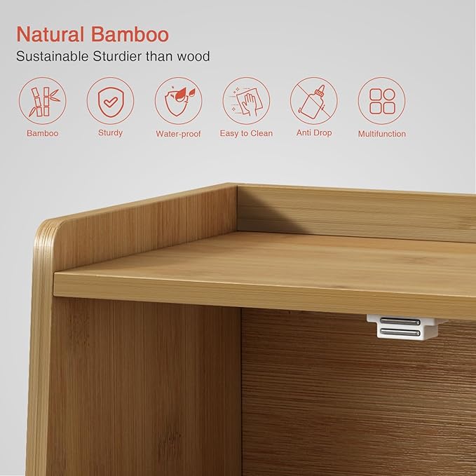 - [Versatile Kitchen Counter Organizer] The bamboo bin can not only for breads storage, but also a clean and good place for holding snacks, fruits, cups, pills and other things. And the bread box shelf on the top adds more counter storage space, you can put spices and other kitchen things on it, keep your counter neat.