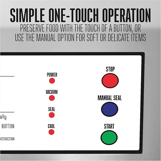 - SIMPLE ONE-TOUCH OPERATION: Preserve foods with the touch of a button, or use the manual mode for more control when sealing delicate foods. The easy-read LED lights monitor the stages of the sealing process.