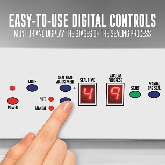 - DIGITAL CONTROLS: The vacuum sealer is easy to operate using the digital control panel with LED lights. The display window tracks vacuum time and heat seal time. In addition to being programmable, you can choose automatic or manual modes.