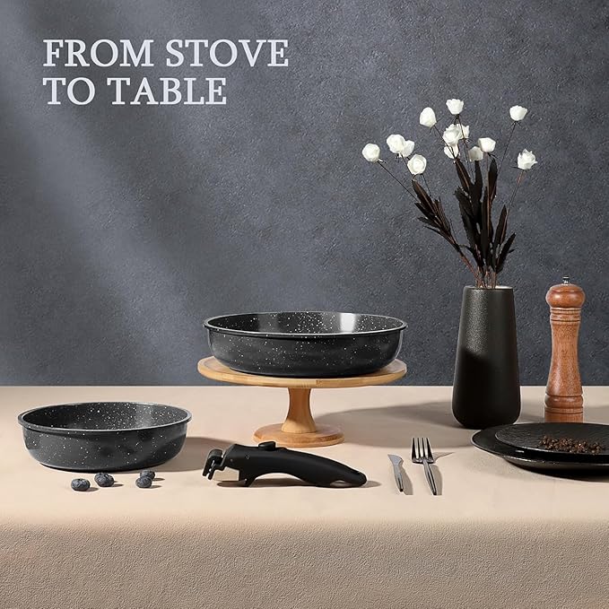 - Convenient Cookware Set - Removable handle for the ultimate versatility– go from all kinds of stoves to the oven, to the grill, to the fridge, and onto the dinner table in a click