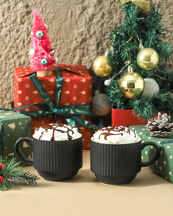 Hasense 15OZ Ceramic Stackable Coffee Mugs Set of 2, Large Porcelain Coffee Cups Set with Ribbed Design and Handle for Cappuccino, Latte, Cereal, Americano, Tea Bag and Beverage, Matte Black