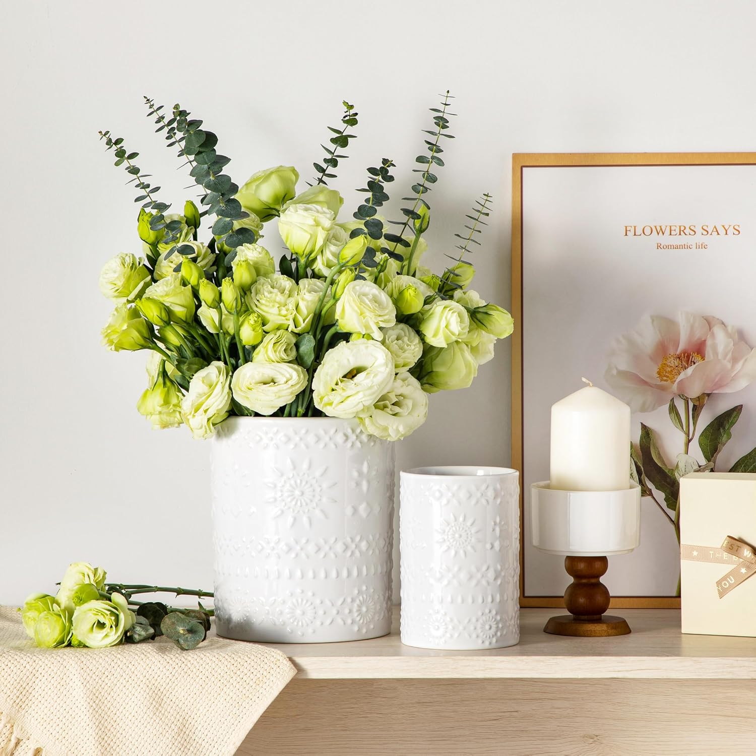 LOVECASA Utensil Holder, 7.2"+5.4" Ceramic Utensil Holder for Countertop, Large Cooking Utensil Crocks for Kitchen Counter, Farmhouse Utensil Vase for Housewarming, Kitchen Decor, Set of 2, Snow