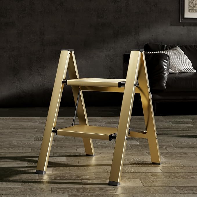HillhutApex 2 Step Stool, Aluminum Foldable Step Ladder, Lightweight Stable Stool with Wide Non-Slip Pedals, 330lbs Bearing Capacity Ladder for Office,Home,Kitchen - Gold