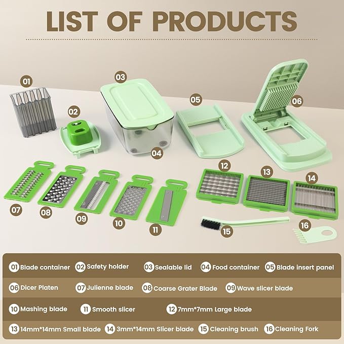 Vegetable Chopper with 8 Blades - Onion Chopper 16-in-1 with Container, Kitchen Vegetable Spiralizer Kitchen Gadgets - Home Essentials - Accessories