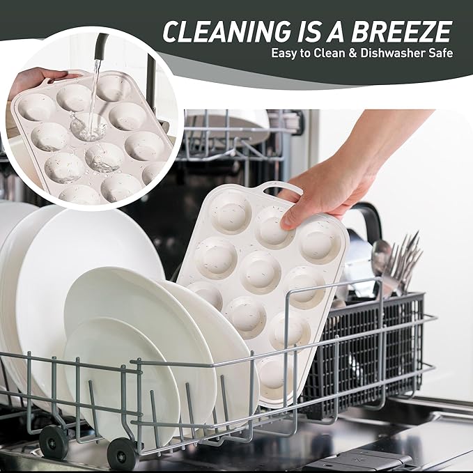 - 【Effortless Release Every Time】Experience 1-second demolding! Simply press the flexible food-grade silicone base to pop out cupcakes intact - no scraping or greasing required. Ideal for sticky recipes like caramel pecan muffins or gooey chocolate lava cakes. Our baking cupcake muffin pan can be safely placed in the dishwasher, and the silicone baking cupcake muffin pan material reduces oil residue by 85% compared to metal baking pans, making it easy to rinse even with simple running water.