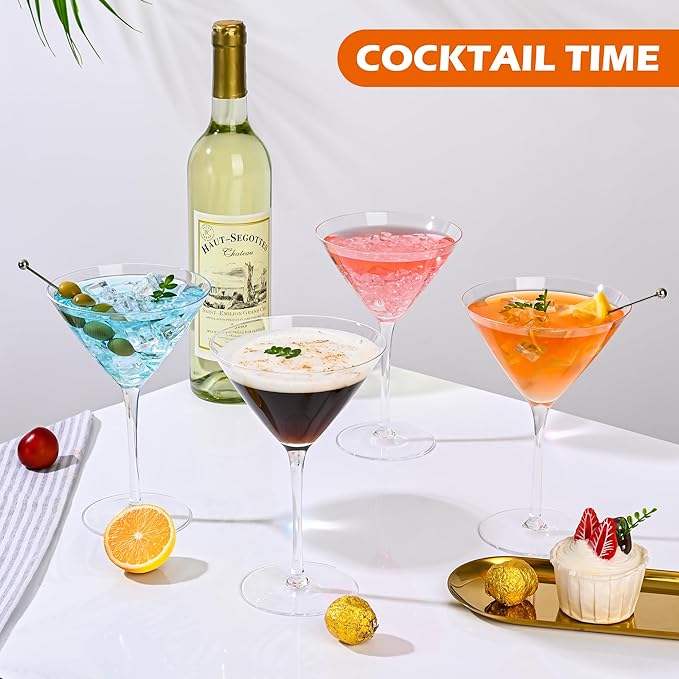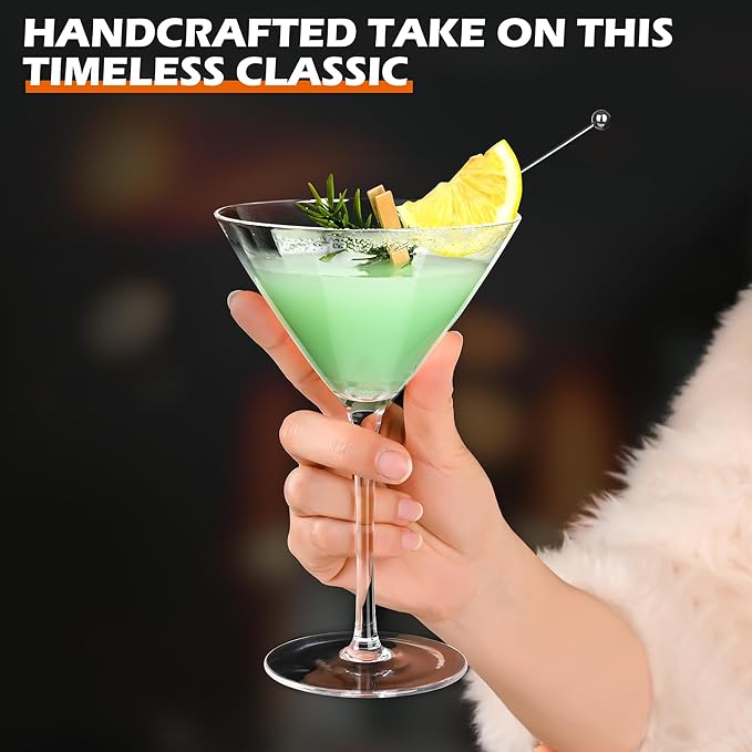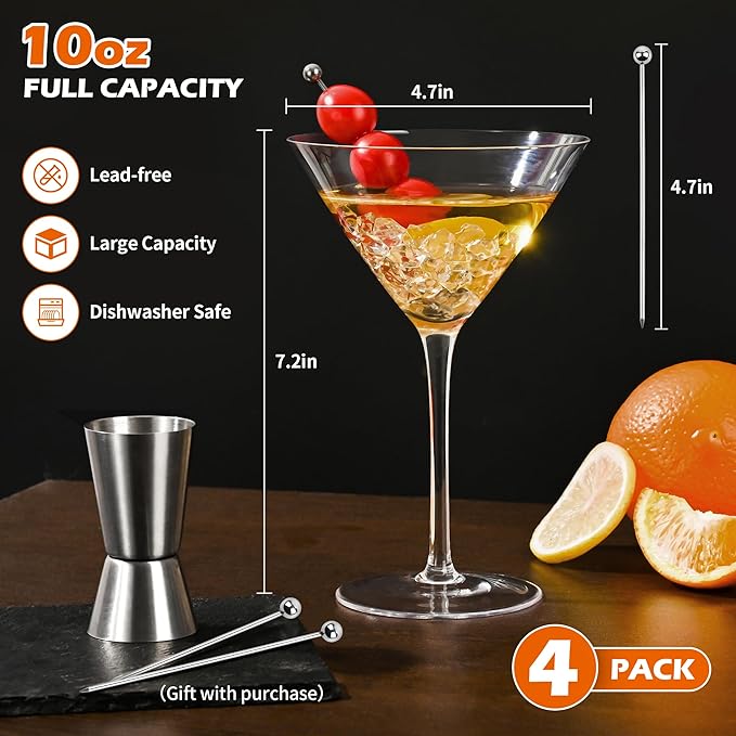 - Package Details:Includes 4 premium crystal martini glasses and 4 matching cocktail picks.Each martini glass holds 10 ounces of liquid,perfect for serving classic cocktails and specialty drinks