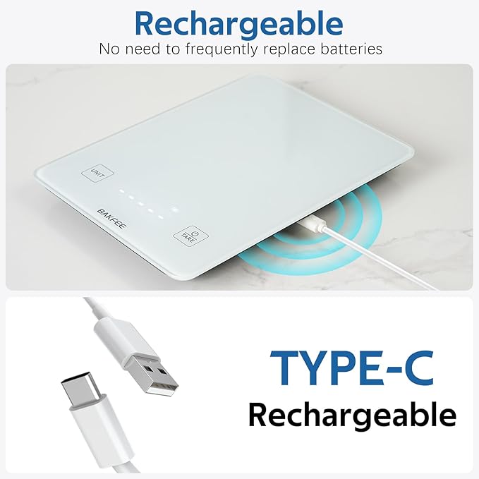 - [ Type-C Rechargeable ]: This glass scale contains a rechargeable internal lithium battery, which does not require frequent battery replacement. Simply charge via USB for long-lasting use, eliminating the need for disposable batteries. It can reduce battery waste, cut long-term costs, and deliver consistent precision.