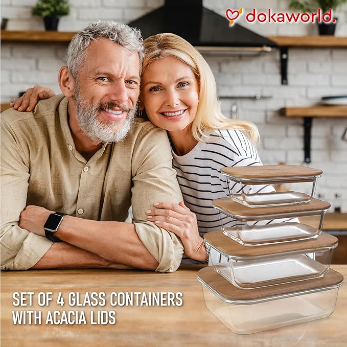 Glass Tupperware Set with Acacia Lids - 4 Stackable Meal Prep Containers. Durable heat resistant Inert Borosilicate Glass