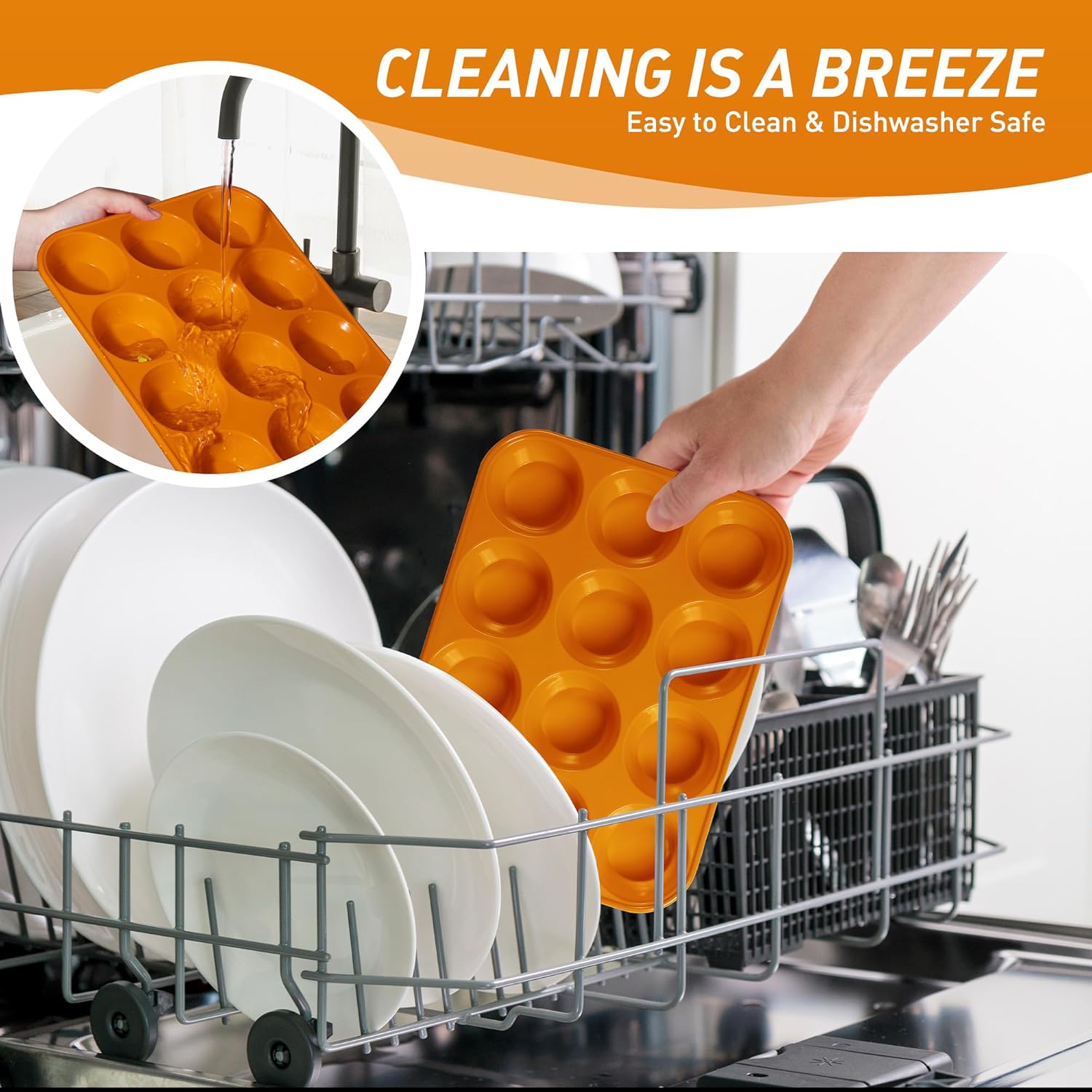- Effortless Release Every Time: The baking cupcake muffin pans features a smooth, nonstick surface that releases baked goods with just a gentle push from the bottom - no messy greasing or stubborn sticking. After baking, simply place the entire baking cupcake muffin pans in the dishwasher for effortless cleaning. Compared to traditional metal baking cupcake muffin pans, our high-quality silicone material resists oil absorption, reducing residue buildup by 85% for quicker, simpler cleanup.