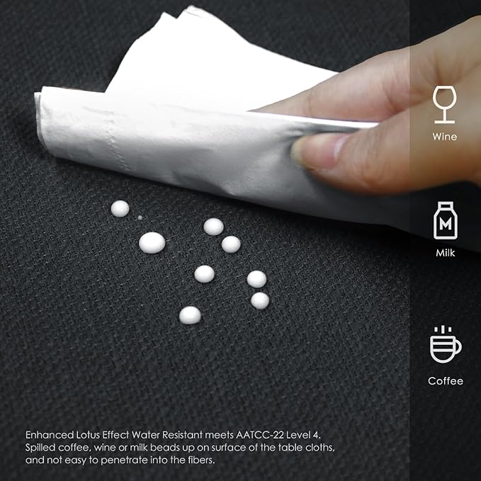 - 【Waterproof Table Cover】Enhanced Lotus Effect Water Resistant meets AATCC-22 Level 4. Spilled coffee, wine or milk beads up on surface of the table cloths, and not easy to penetrate into the fibers. You can absorb the droplets with napkin paper and you NO LONGER need to change and wash the table cloth every day