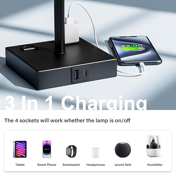 - 2. USB A & C and AC Outlet for Charging - Power 8 devices at once bed side lamps set! With 2 usb-c ports (5V/2.1A) and 2 usb-a ports (5V/2.1A) and 4 outlets (120v) on the nightstand lamps set of 2, stay connected whether the desk lamp is on/off, whether you're winding down with a tablet in hand or need to recharge your smartphone while working at your desk. With instant access to power, your devices are always within reach whenever you need them.