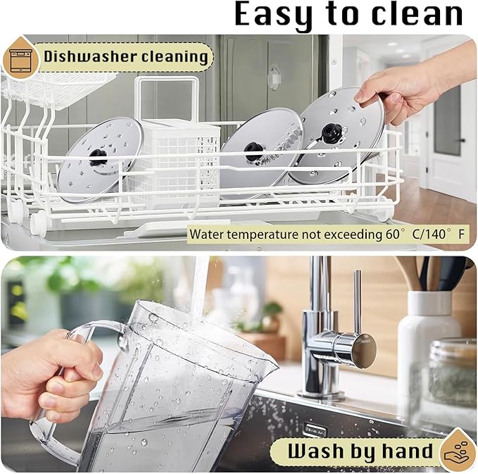 - 【Dual locking protection, safe and easy to clean】 Non-slip feet, overheat protection, safety test, double locking setting. Safeguard the use of food processors, only use when the bowl is locked to the base and the top is locked to the bowl, all accessories except the base can be washed in the dishwasher (water temperature should not exceed 140°F), but need to add the right amount of detergent.