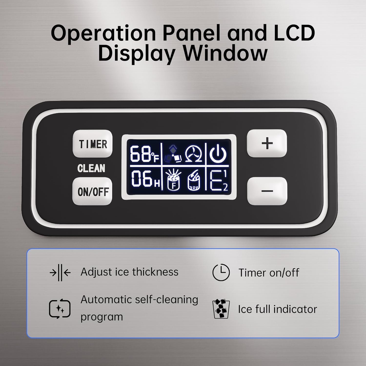 - Multi-function LCD Control Panel: It can control the machine to start and stop, automatically self-clean, adjust ice thickness, display ice full and ambient temperature, remind you to check the temperature of the surrounding environment to ensure ice making efficiency