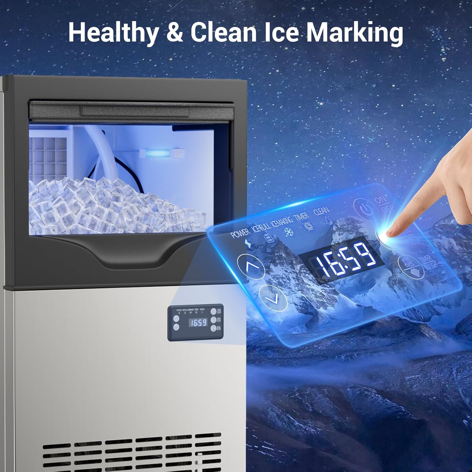 - Advanced Control Panel Features: The panel displays the surrounding temperature, ensuring you remain aware of the environmental conditions to maintain optimal ice production efficiency. The newly added timer function allows you to schedule ice-making in advance, and the machine will automatically halt when the storage reaches full capacity. Additionally, the blue light helps to neutralize odors, improving the quality of the ice cubes. You can conveniently monitor the ice-making process in real time, adjust the cube thickness, and even set reservations.