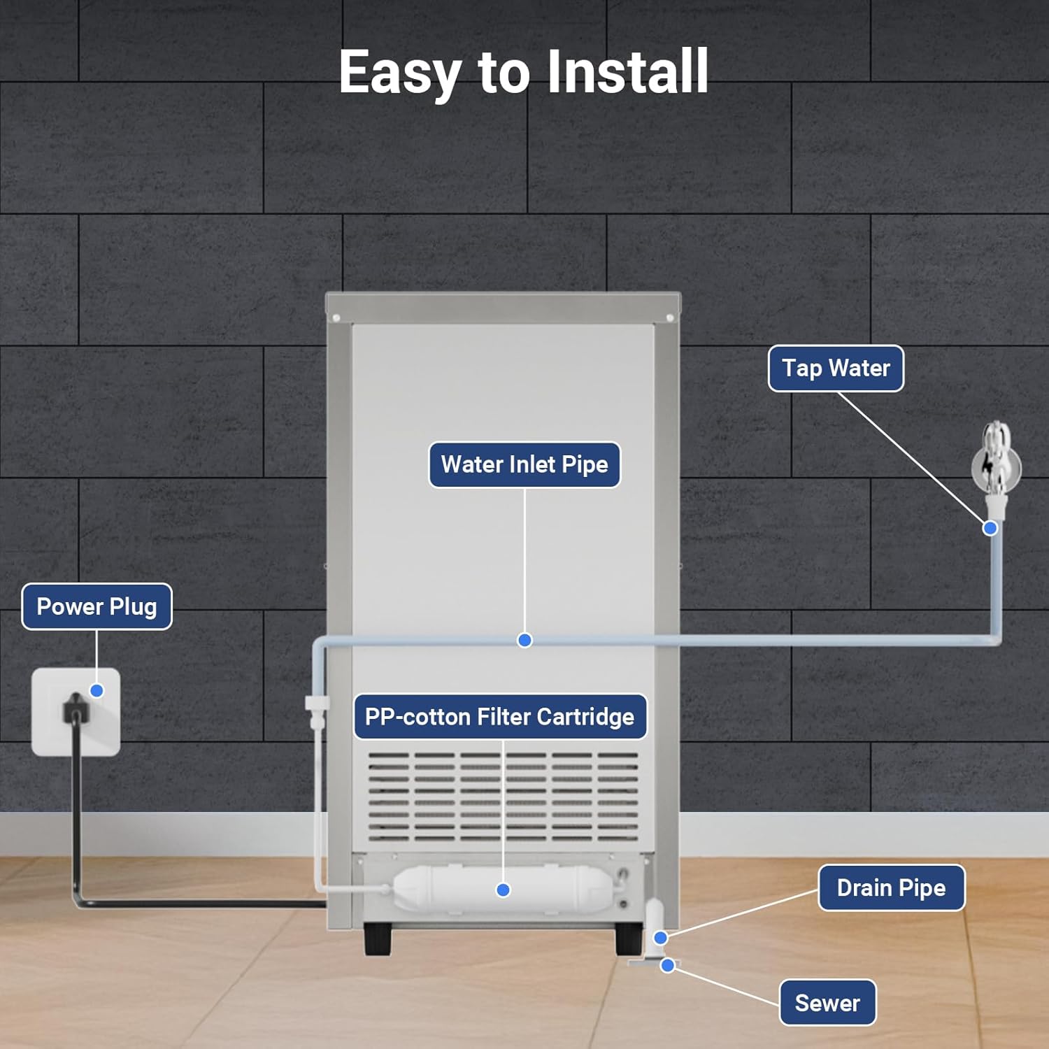 - User-Friendly Design: The freestanding undercounter ice maker is simple to install, featuring four adjustable screw-in feet that allow you to level the unit on uneven surfaces. The water source isn’t limited to tap water, giving you the flexibility to place the machine wherever it’s needed. Whether freestanding or built-in, it’s perfect for a variety of settings, from bustling restaurants and offices to casual family events.