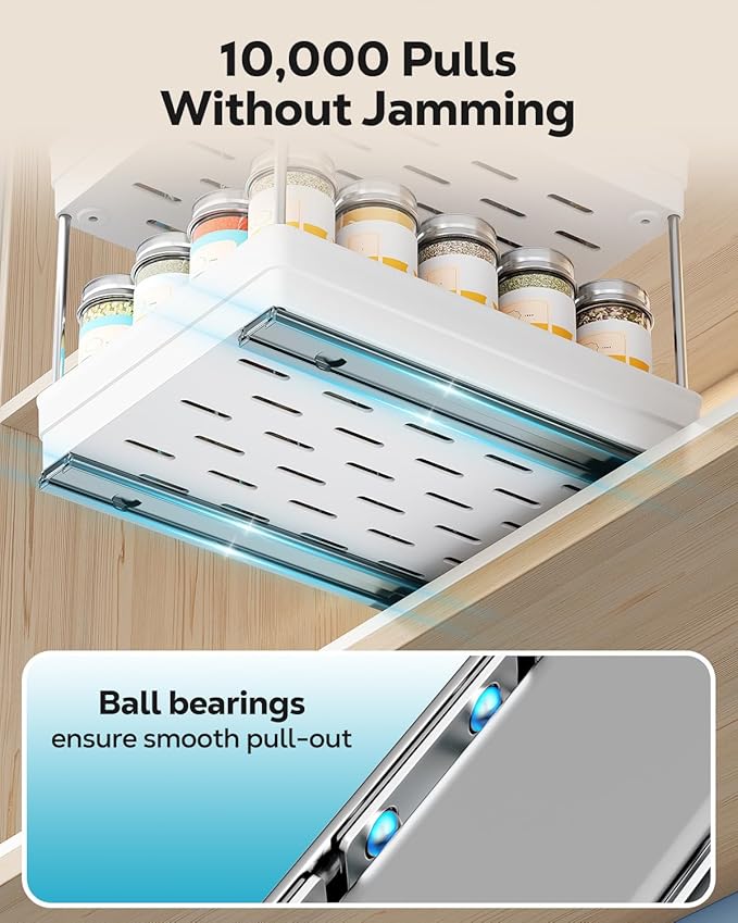 - [Ultra-Smooth Gliding] High-quality ball bearings ensure effortless 10,000+ slides—no jamming, you can still quickly pull out the spice rack to grab what you need even when you're rushing around cooking.