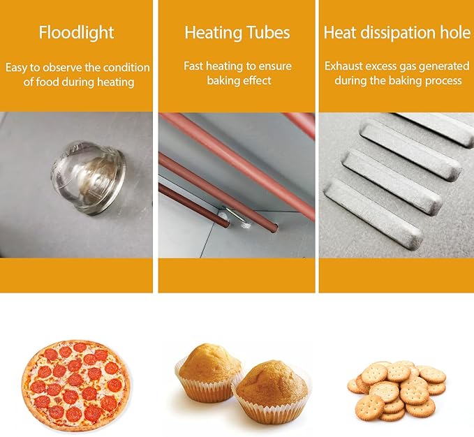 - Widely applicable: This oven can bake six 8-inch pizzas or one 16-inch pizza at a time. Suitable for cooking pizzas, biscuits, breads, cakes and various meats at home, restaurants, bakeries, snack shops, parties and other places