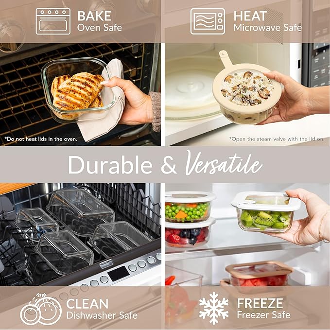 - Splatter-Free, Space-Saving, & Easy to Clean: VentSmart glass and silicone lids feature a built-in steam valve that allows for safe venting when heating, and splatter-free microwaving without removing the lid. The containers nest neatly for compact storage, and their dishwasher-safe design ensures effortless cleanup after every use.