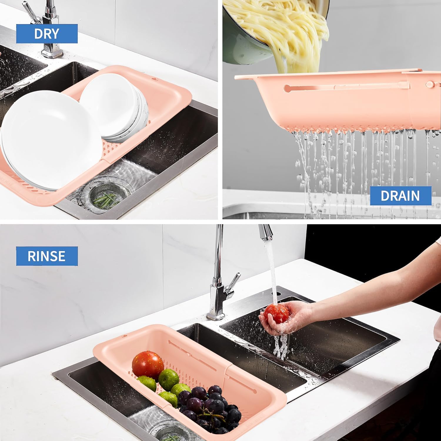 LASSHSWA Collapsible Colander and Strainer for Kitchen, Over the Sink Strainer Basket for Kitchen, Fruit Pasta Food Strainer Expandable Plastic Colander with A Sink Drain Strainer Stainless Steel