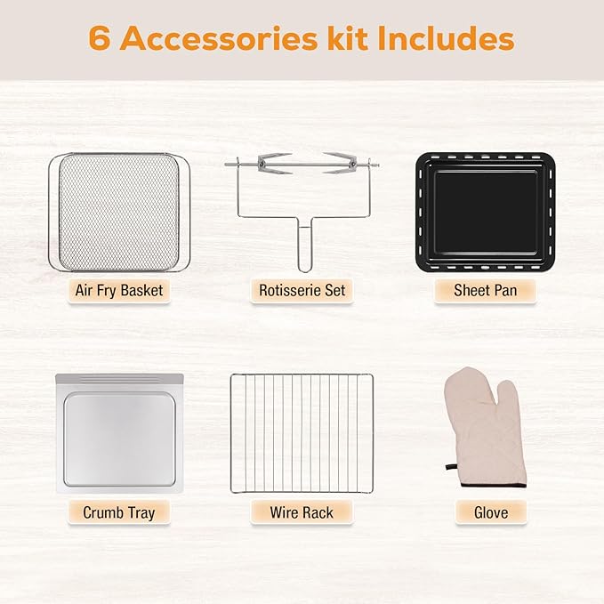 - š¦ 6 Accessories for Everything: Air fry basket, wire rack, crumb tray, rotisserie kit, roast basket and glove.