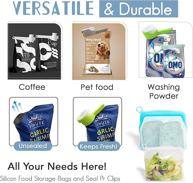 - ✅ MULTIPURPOSE KITCHEN ESSENTIAL – These silicone zip-lock bags and bag sealing clips offer versatile storage solutions for the kitchen and beyond. Use them for meal prepping, snack storage, baby food, travel, camping, and organizing dry goods. The airtight bag clips with pour spout allow easy pouring of grains, coffee, and sugar, making pantry organization simple. These heavy-duty food storage clips and reusable silicone bags are must-haves.