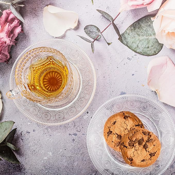 - Premium Quality: Our Vintage Glass Tea Cups and Saucers Set of 6 is crafted from high-quality glass, ensuring durability and elegance. These Glass Coffee Mugs are perfect for serving a variety of beverages, including espresso, cappuccino, latte, and tea.