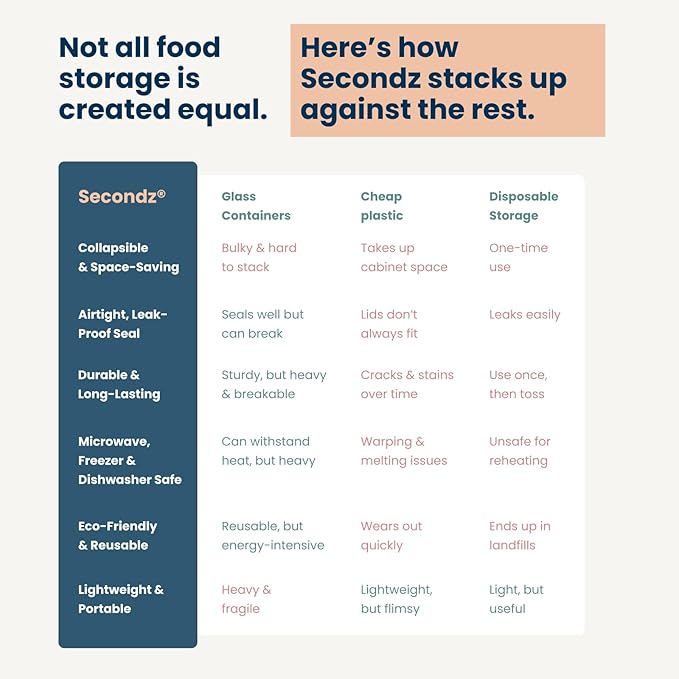 - PREMIUM BPA-FREE SILICONE: Made from high-quality, food-safe silicone, Secondz is durable, flexible, and built to last. Free from harmful chemicals, these containers keep your food safe and fresh, meal after meal.