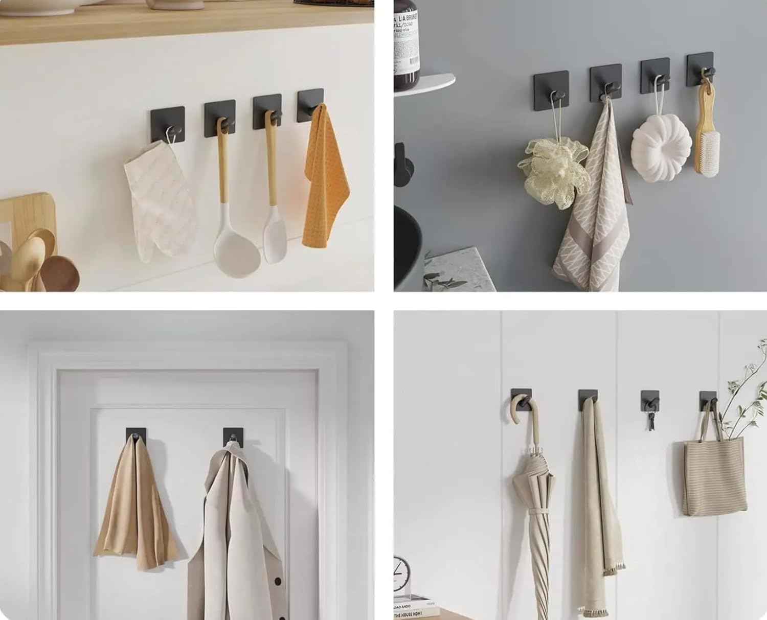 - Multi-Use Wall Hooks – Organize Every Corner of Your Home Our 4-pack of black adhesive wall hooks offers endless organization possibilities throughout your home. In the entryway, keep keys, coats, or dog leashes at arm’s reach. In the bedroom, hang accessories, hats, or bags with ease. In the bathroom, they’re perfect for towels, loofahs, and robes. The kitchen? Ideal for utensils, potholders, and cleaning cloths. Even in the garage, laundry room, or office, these hooks add functional storage without taking up space.