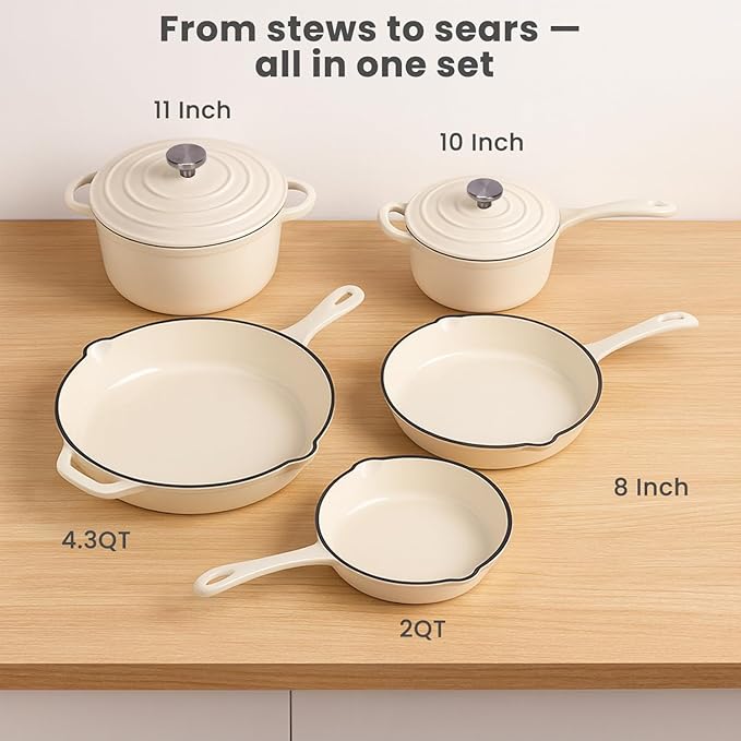 - 【What You Get?】This enameled cast iron cookware set includes a 4.3QT Dutch oven with lid for roasts, soups, and bread, a 2QT saucepan with lid for sauces and oatmeal, and three skillets—8", 10", and 11"—perfect for eggs, pancakes, and family meals. Versatile and durable, this set makes cooking and baking at home efficient and enjoyable.